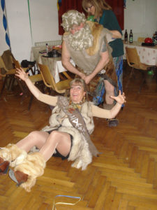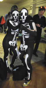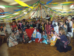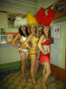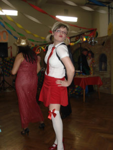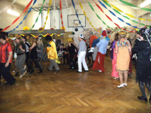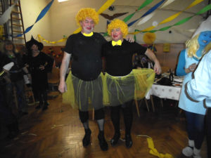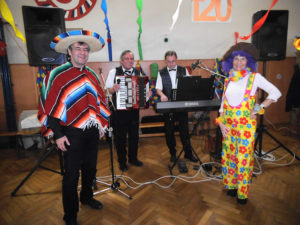 A nebyli by to divadelníci, kdyby nepřipravili pro návštěvníky speciální překvapení. To přišlo jako „půlnoční překvapení“ a tím také bylo! V barvách reflektoru se postupně vyrojili a svými tanečními kreacemi rozesmáli Marek alias Freddy Mercury, Tomáš křepčil coby Tina Turner, „Sestru v akci“ Whoopi Goldberg předvedl skvěle Igor a idoly dnešního světa dovršil nepřekonatelný Jirka jako Lady Gaga. Ovšem korunu všemu nasadila „dvě žlutá kuřátka“ Drobeček a Mirek, kteří vyvolali svou písničkou a tanečkem salvy smíchu. A nakonec zvedla všechny ze židlí mašinka, která projížděla zamaskovanou tělocvičnou jako dravý vláček. Při pohledu na muzikanty jsem si všimla, že i oni podlehli všeobecnému veselí a při hře se radovali z naší radosti. A tak to má být!