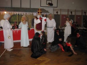Sobota 6. prosince byla nevlídně uplakaná jako den předtím, kdy měl po městě chodit sv. Mikuláš v doprovodu anděla a čerta a rozdávat hodným dětem dárečky. Na cestě do sokolovny ve Steinergasse, kterou jsme jeli nazdobit, jsme však žádného Mikuláše nespatřili. Ten se objevil až na merendě, zato měl početnou družinu! Doprovázel ho průvod čertů, čertic, andělek a jeden svalnatý anděl, který vypadal jako nebeská ochranka.