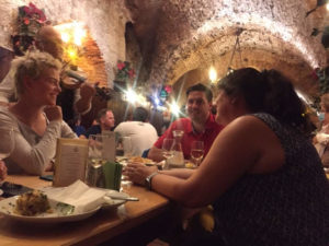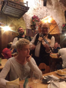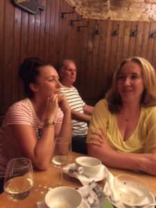 Sobotní večer jsme společně strávili v blízkém vinném sklípku „Zwölf Apostel Keller“, kde jsme už nejméně 10 let „Stammgasti“ a kde už máme známé hudebníky. Ti nám zahrají každou píseň a melodii, na kterou si vzpomeneme. Někdy si i trochu zatancujeme k obveselení turistů a letos nám Mirek zazpíval na přání „Joj, cigán“ z operety Hraběnka Marica. V neděli jsme se s ním rozloučili s tím, že se budeme těšit za rok opět i s jeho asistentkou, herečkou Ivanou Plíhalovou z Olomouce, která se tentokrát omluvila pro nemoc.